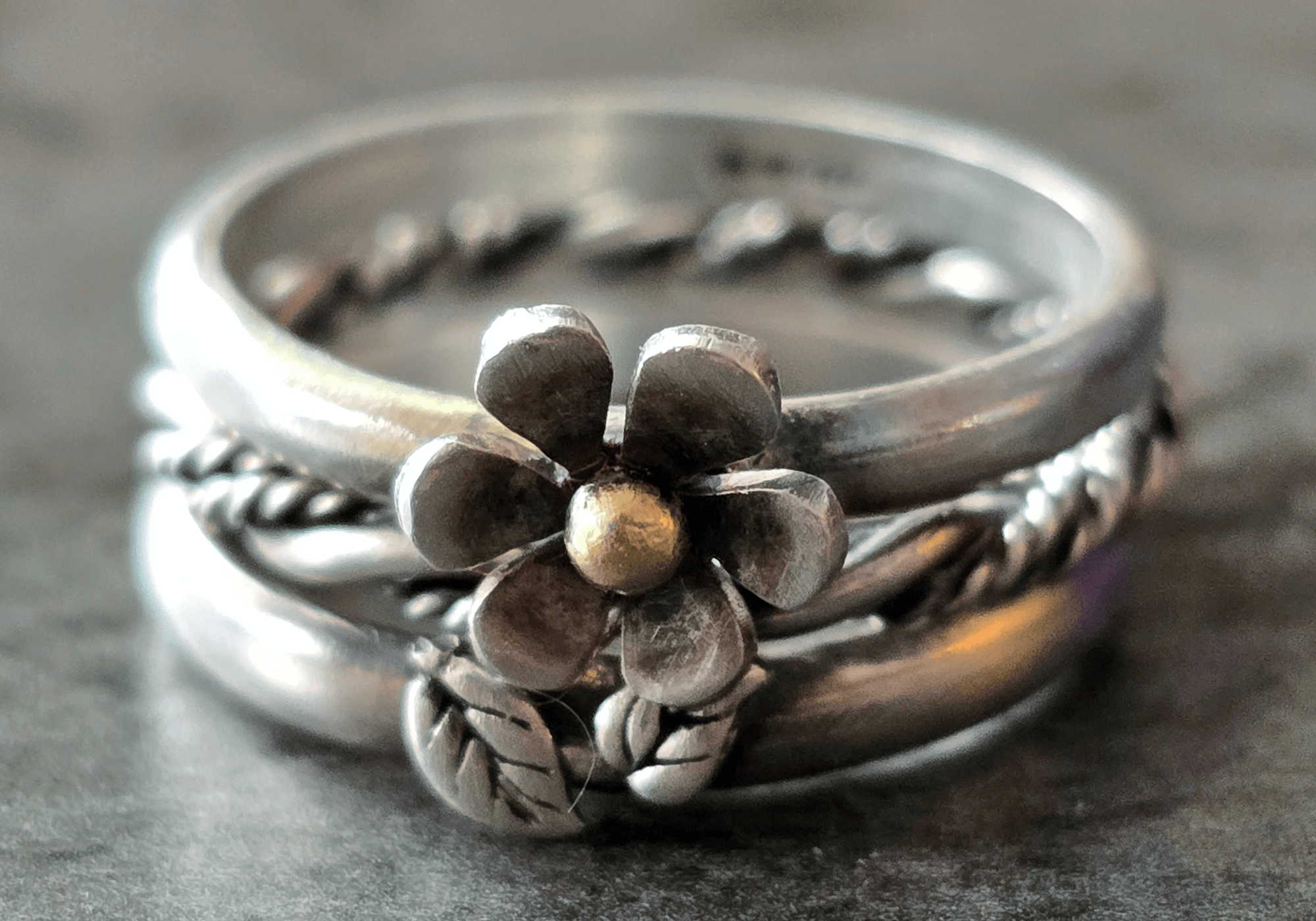While sterling silver is our specialty, don’t be afraid to mix in gold accents or other metals. One of our standout designs features a flower ring with an 18K gold ball accent in the middle of the flower. It’s your stack—make it yours.