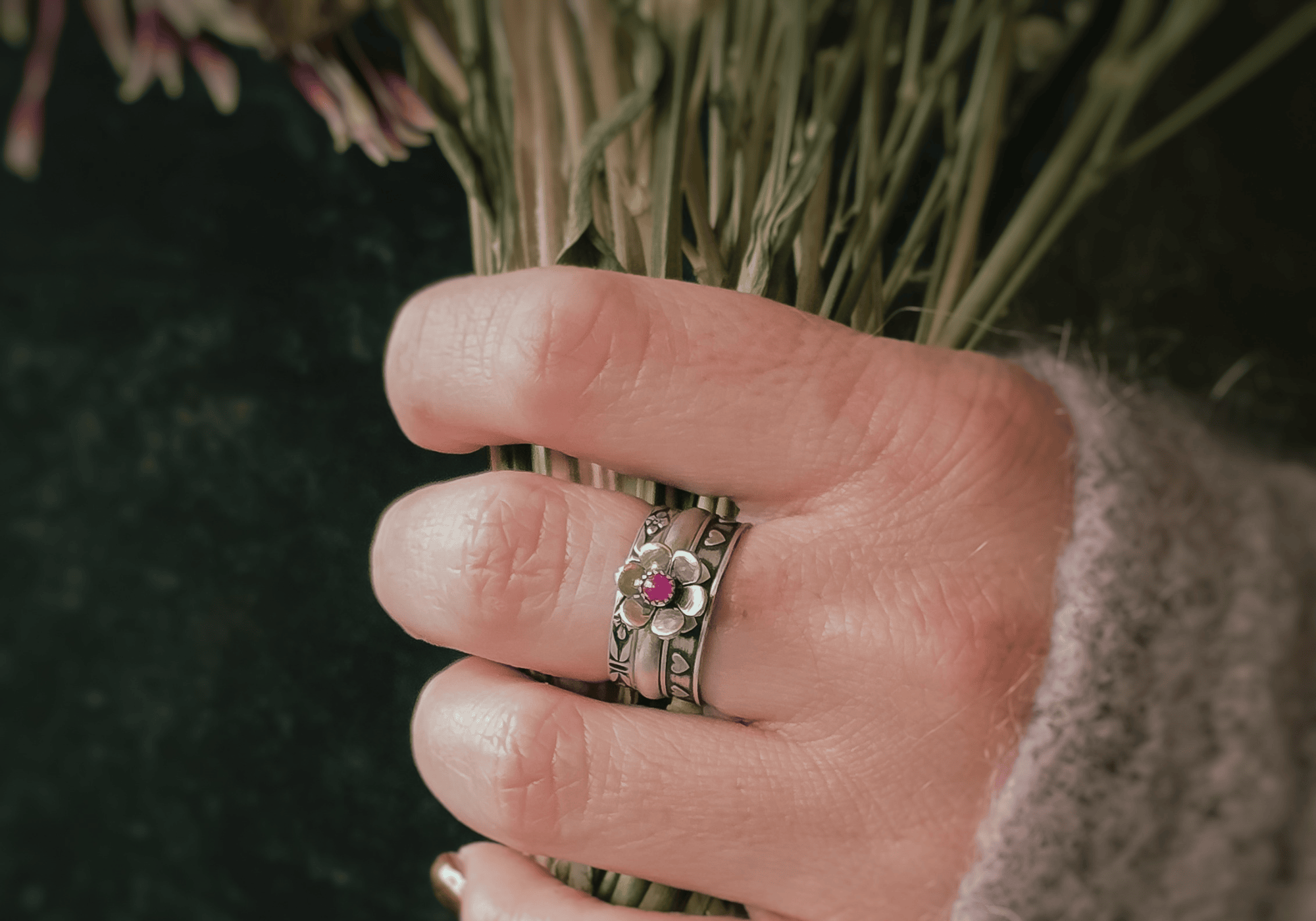 Heading to your next music festival? Pair the turquoise flower ring with pink tourmaline. Add a textured band for that boho-meets-witchy vibe that’s perfect for dancing under the stars..