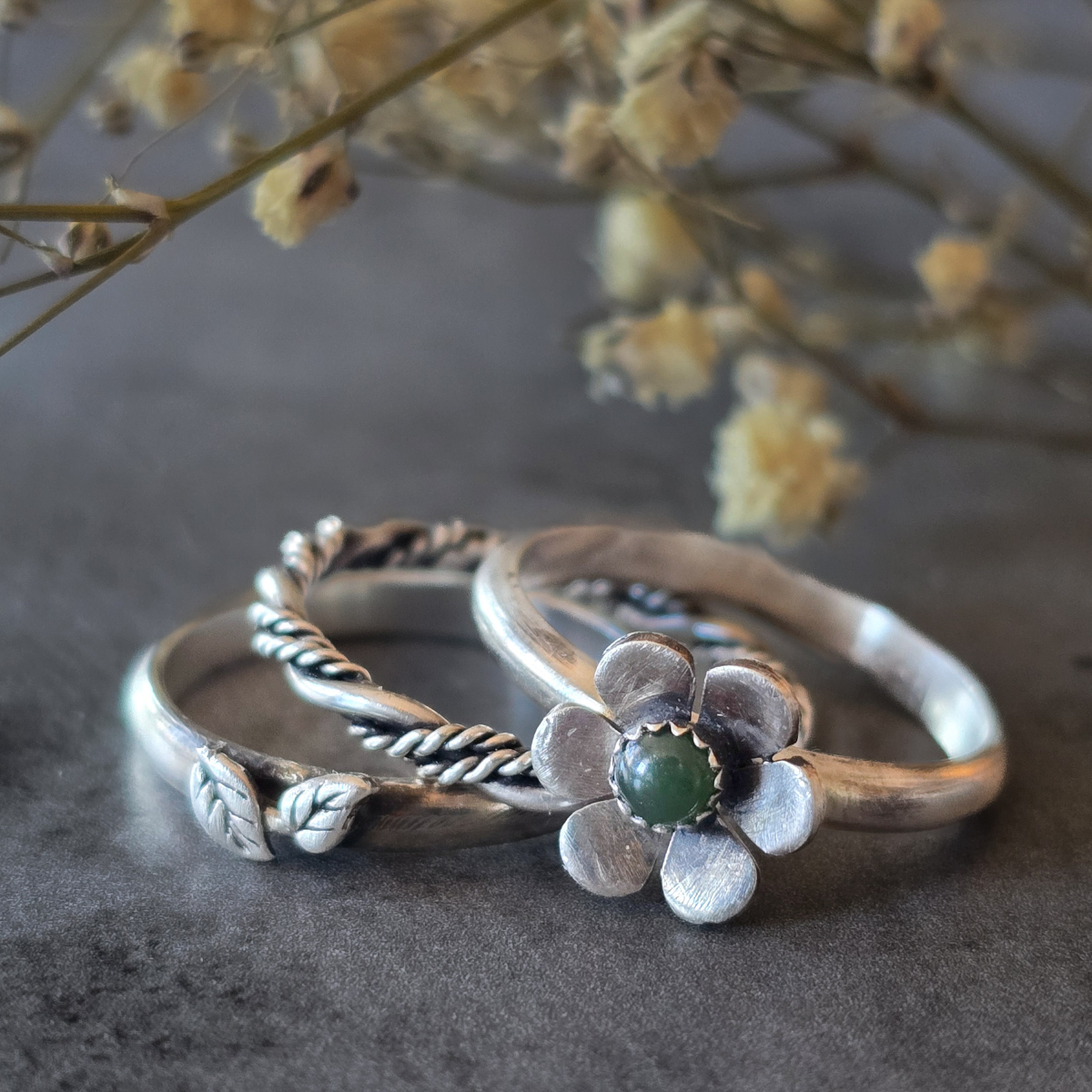 Combine our nephrite jade flower ring with a twisted silver band and a leaf-textured ring. This combo is perfect for grounding yourself and connecting with nature.