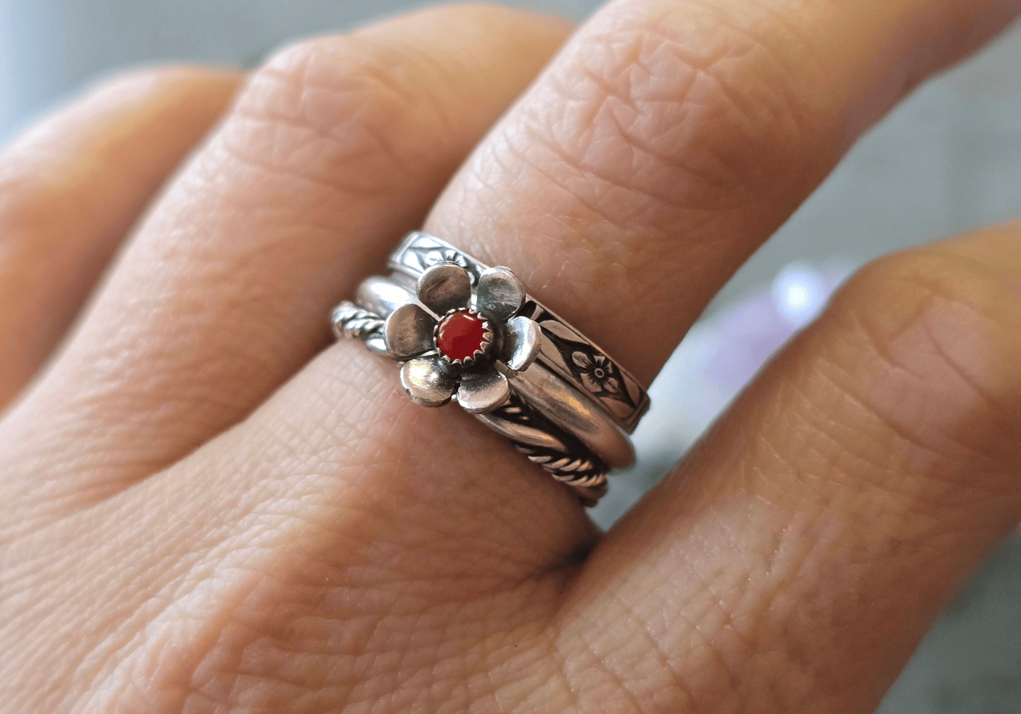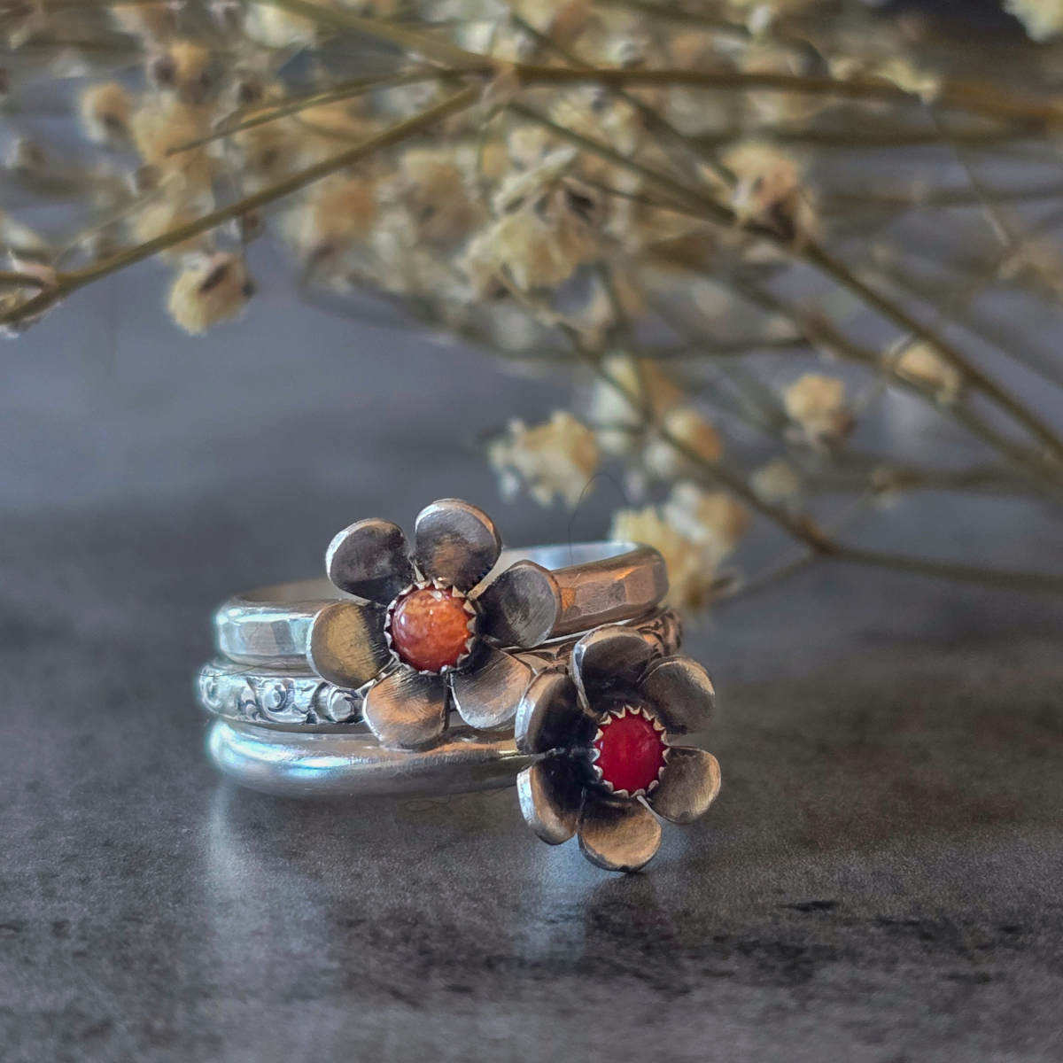 Stack the coral flower ring with a sunstone centerpiece and a sleek minimalist band. This fiery combo is all about confidence and boldness.