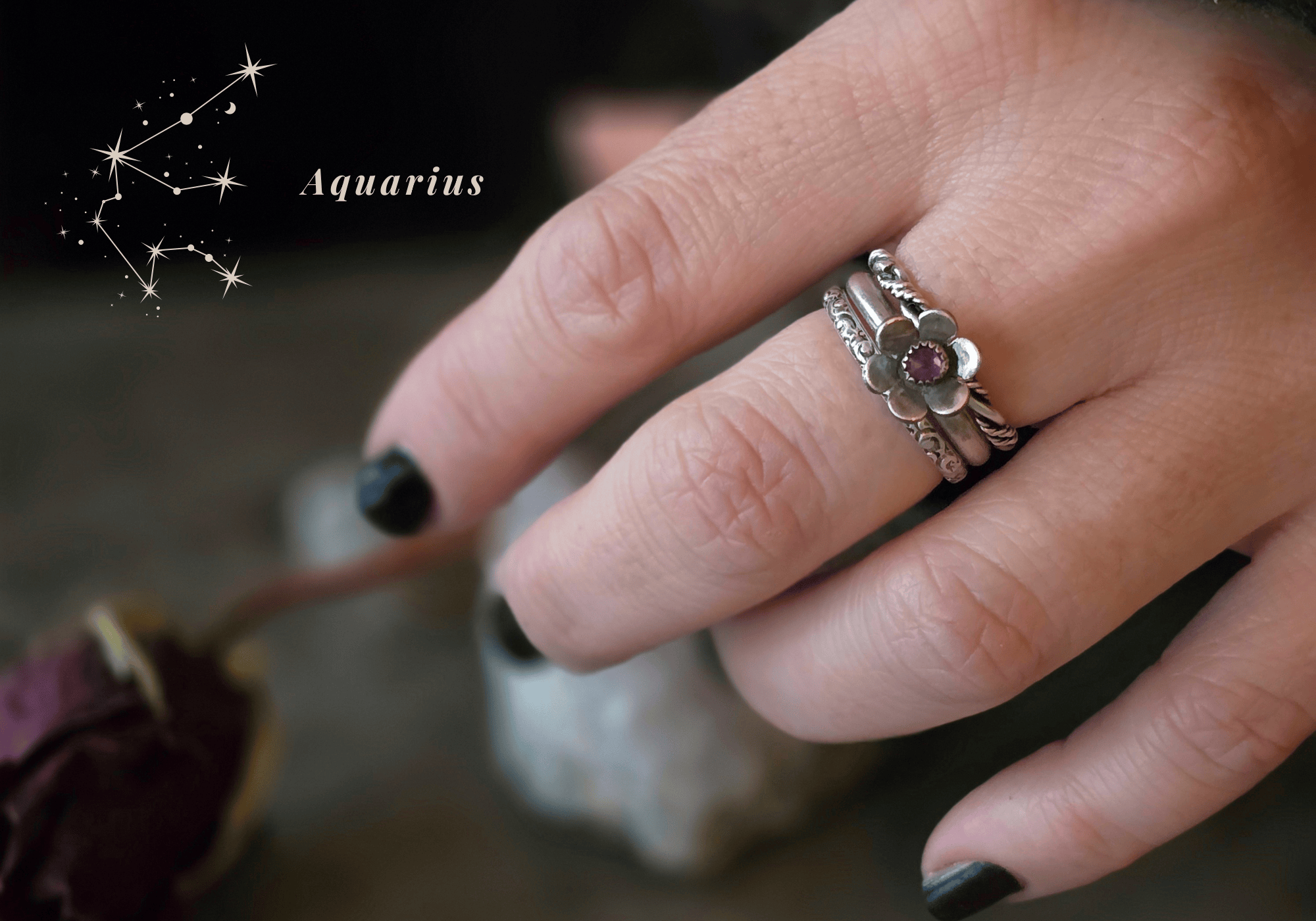 Stack Idea: Style the Amethyst Flower Ring with the Twirly Band for a modern twist and the Twisted Wire Band to add a unique, artistic touch. This stack reflects Aquarius’ creative and forward-thinking energy.