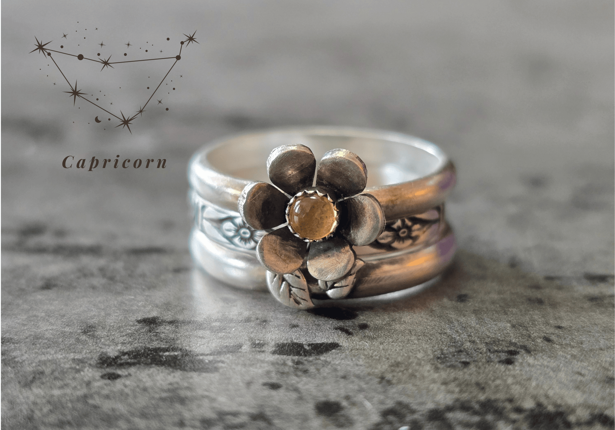 Stack Idea: Combine the Citrine Flower Ring with the Floral Band for timeless elegance and the Leaf Band for a hint of organic elegance. This stack reflects Capricorn’s determination and refined style.