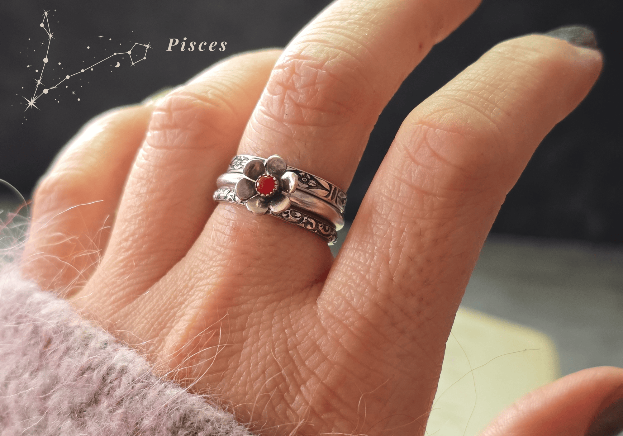 Stack Idea: Pair the Coral Flower Ring with the Twirly Band for a soft, natural vibe and the Floral Band for a touch of whimsical charm. This stack embodies Pisces’ imaginative and mystical spirit.