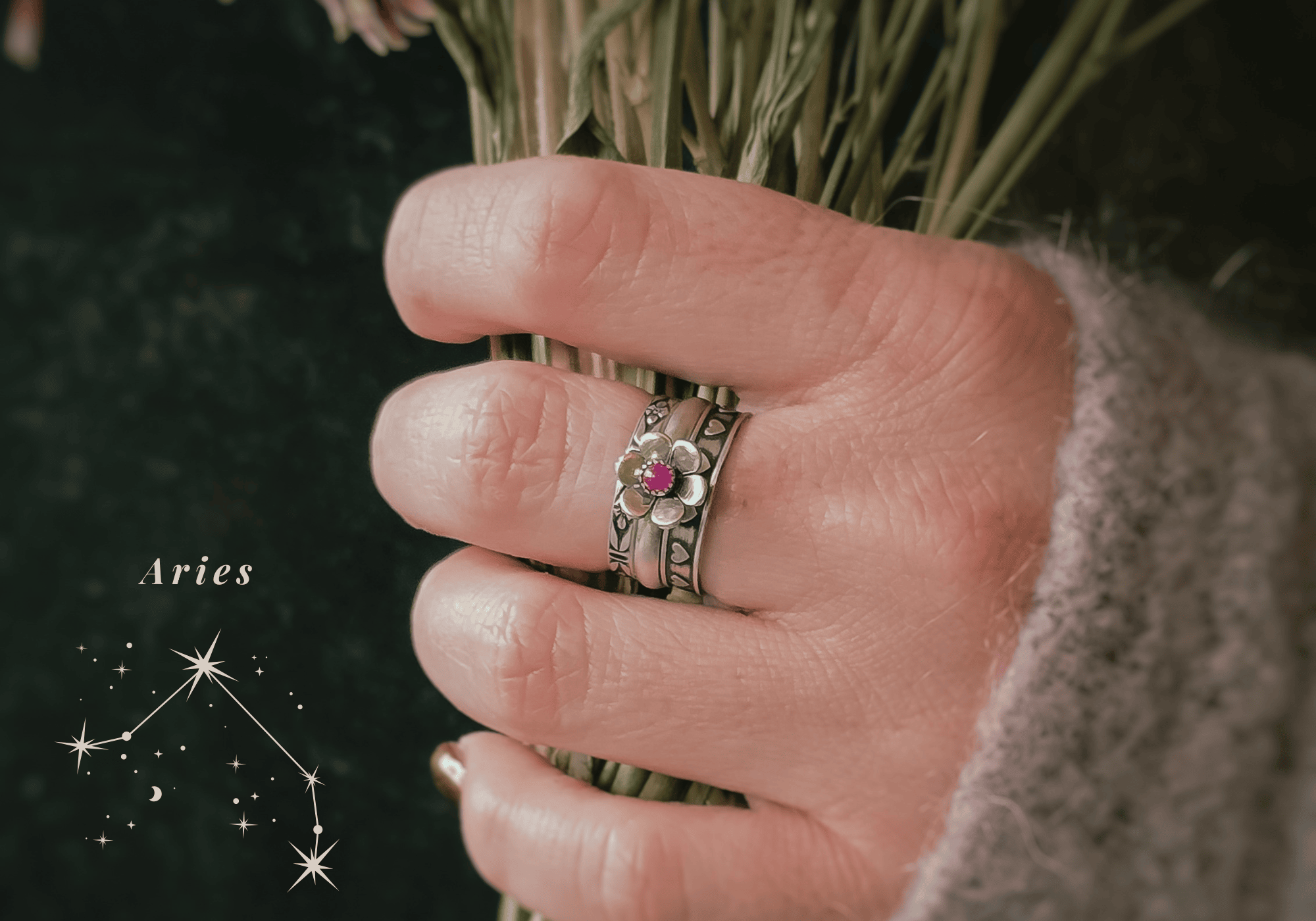 Stack Idea: Pair the Ruby Flower Ring with the Hearts Band for bold texture and the Floral Band to add a touch of elegance. This stack reflects Aries’ passionate and fearless energy, making a statement as fiery as their personality.