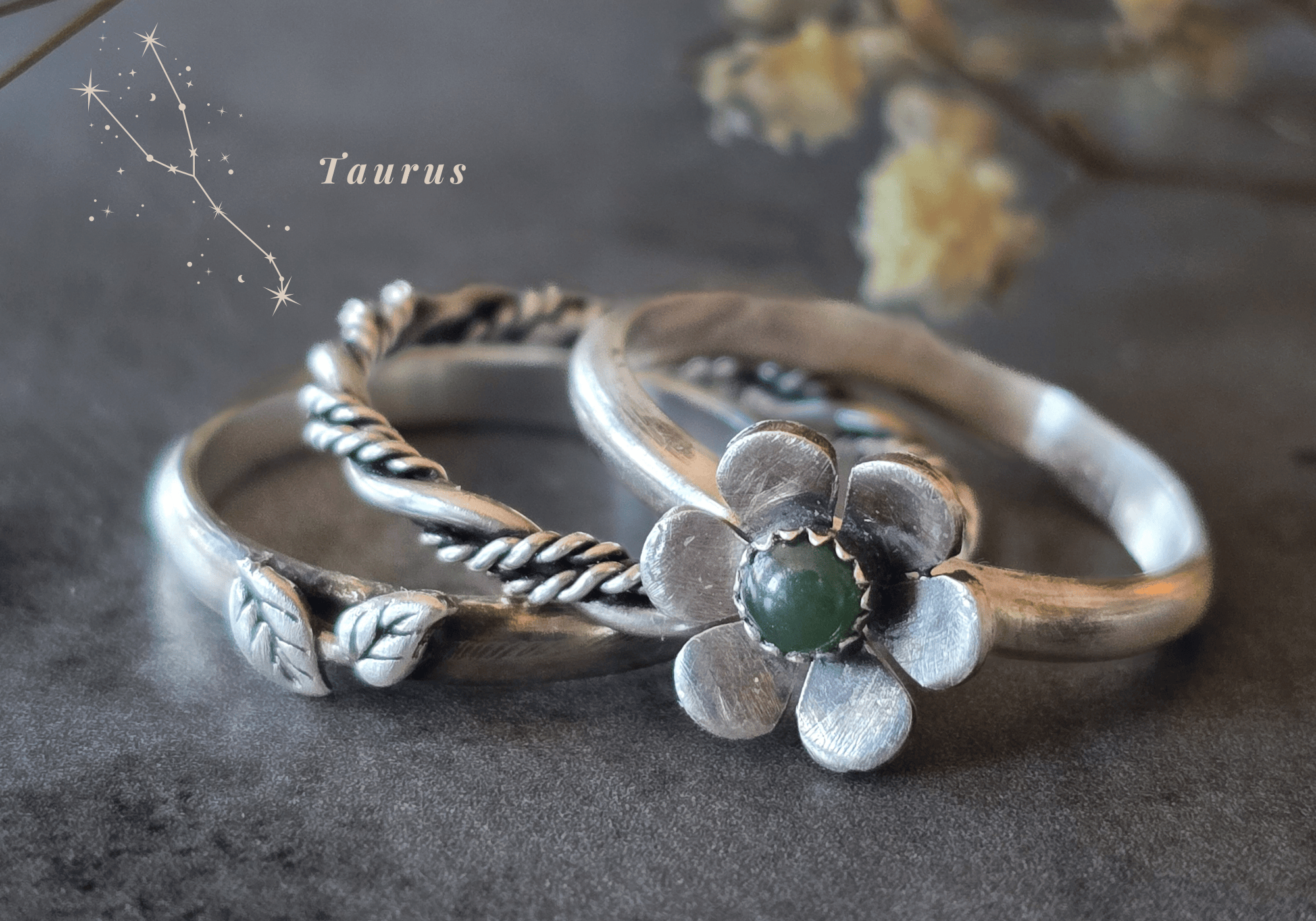 Stack Idea: Style the Nephrite Jade Flower Ring with the Leaf Band for a nod to Taurus’ love of nature and the Twisted Wire Band for a hint of timeless charm. This stack mirrors Taurus’ grounded, luxurious vibe.