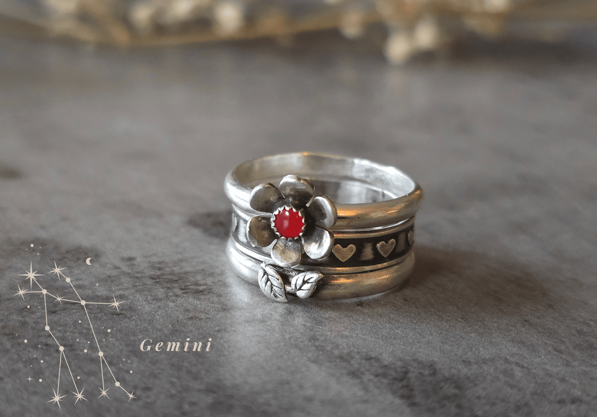Pair the Coral Flower Ring with the Hearts Band for playful energy and the Leaf Band for a dynamic, natural look. This stack reflects Gemini’s vibrant, ever-changing personality and love for variety.
