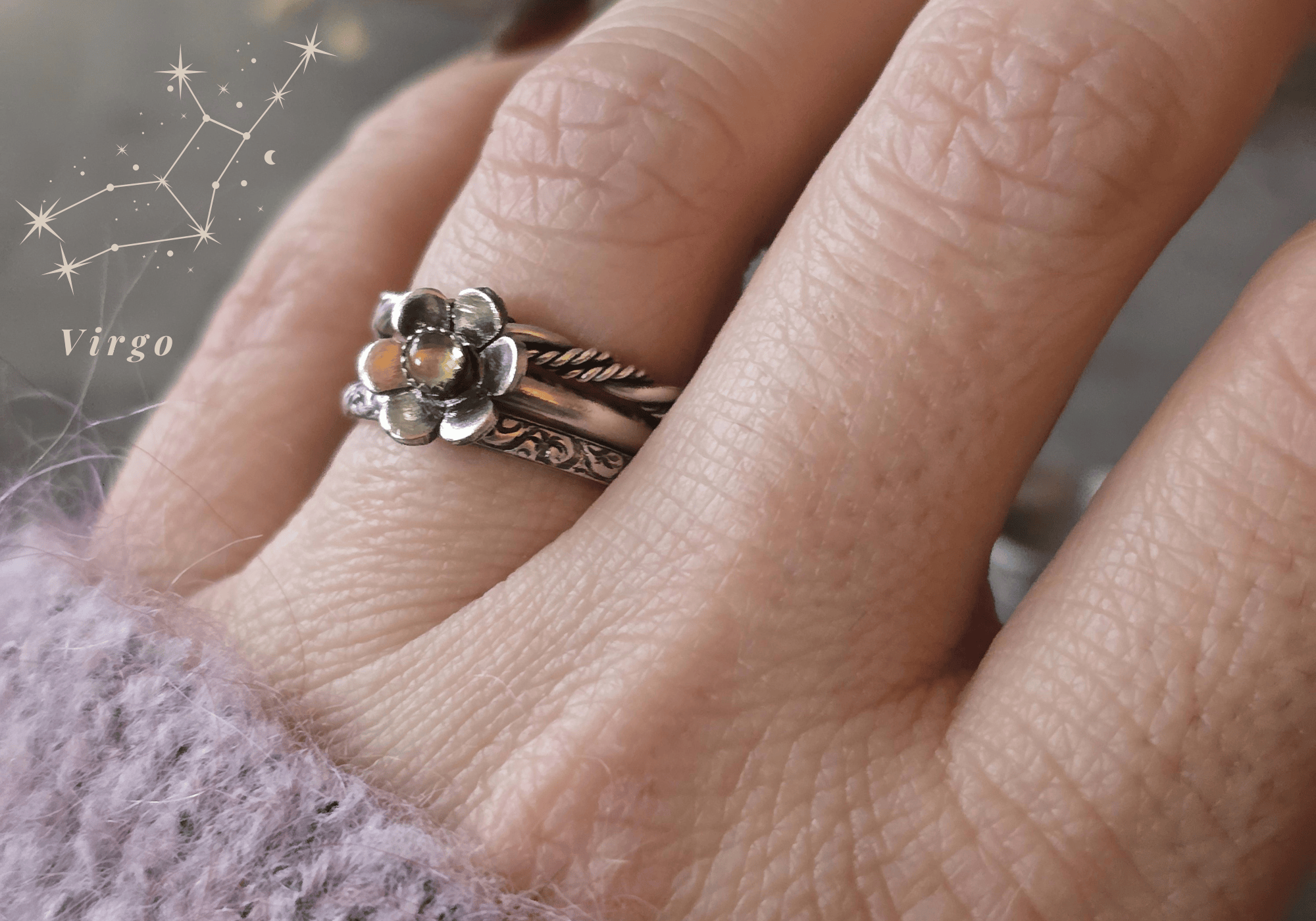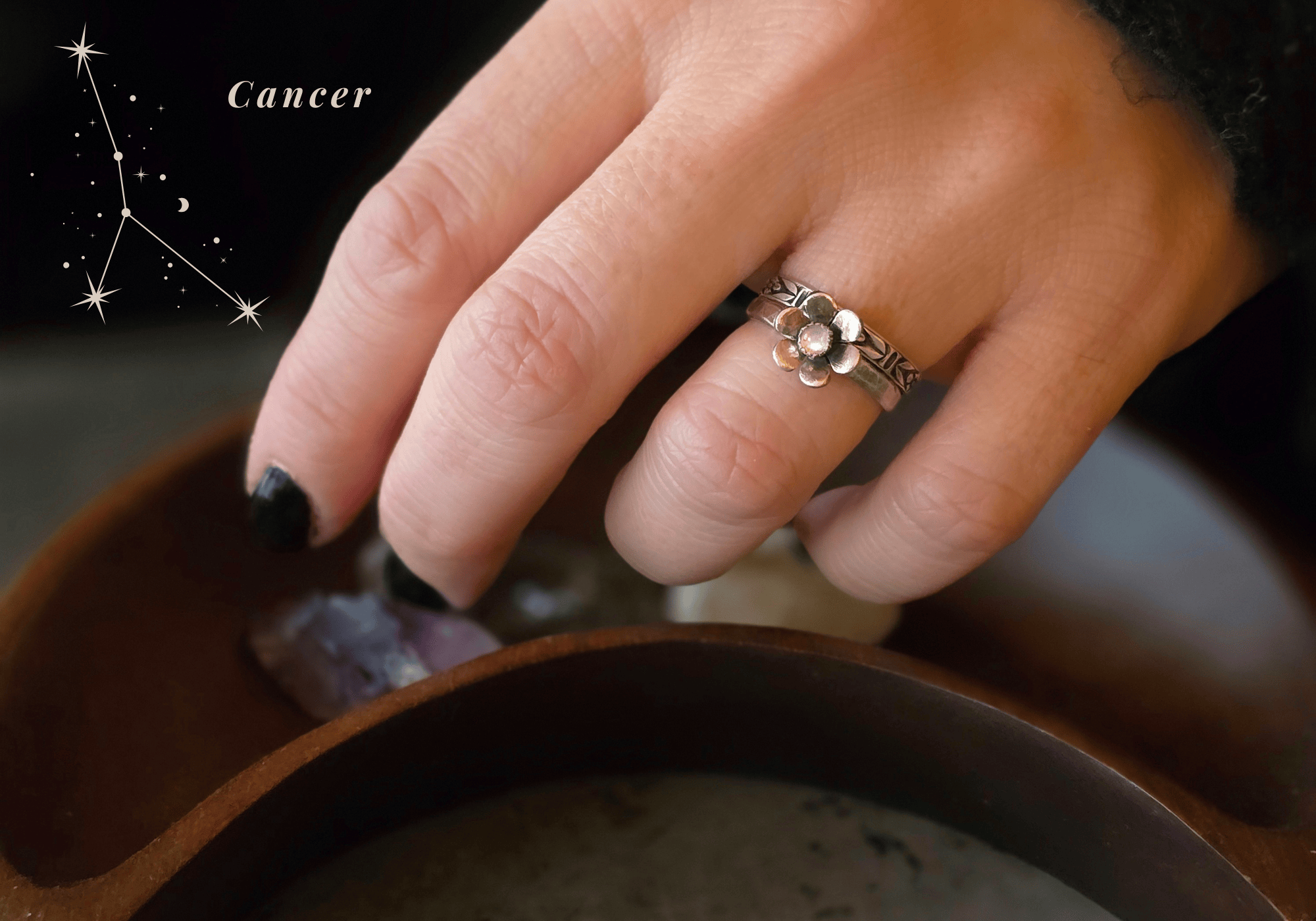 Stack Idea: Combine the Moonstone Flower Ring with the Floral Band for a dreamy, nurturing touch to symbolize Cancer’s emotional depth and connection to the moon.