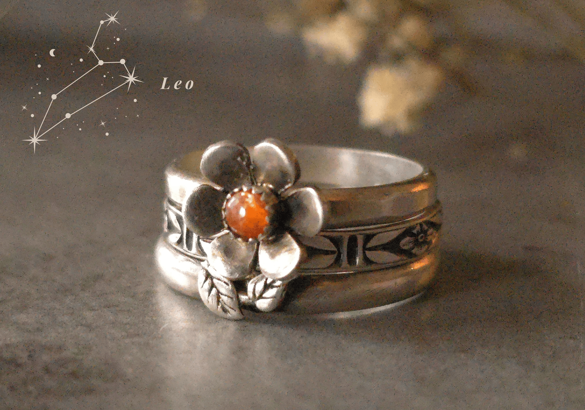 Stack Idea: Style the Sunstone Flower Ring with the Floral Band for a bold statement and the Leaf Band to channel the essence of nature's beauty. This stack radiates Leo’s natural warmth and magnetic charm.