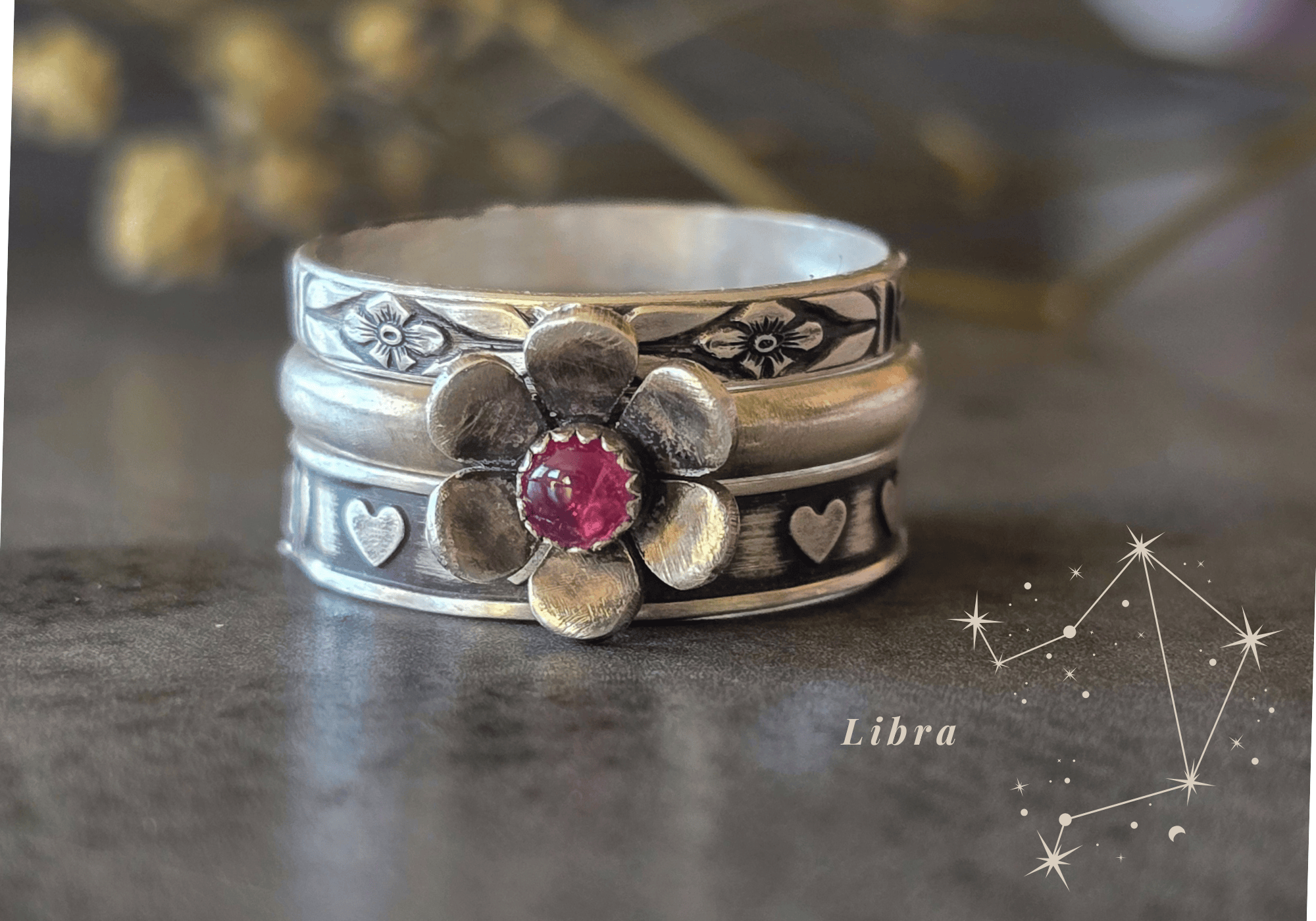Stack Idea: Combine the Pink Tourmaline Flower Ring with the Hearts Band for a romantic vibe and the Floral Band for a balanced and graceful finish. This stack captures Libra’s charm and love for beauty.